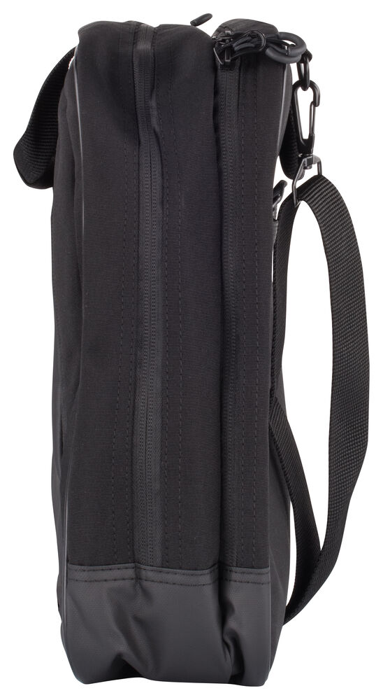 Elegant laptopbag. Tre store rom separert av en vattert sleeve som beskytter laptopen. Flere små rom for oppbevaring av accessories på innsiden. Avtagbar skulderstropp med plass til visittkort. To vatterte håndtak og to store ytterlommer med glidelås. En solid stropp bak gjør det mulig å feste baggen på en trolley.