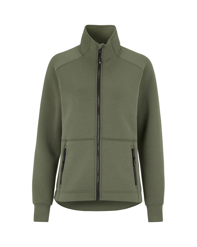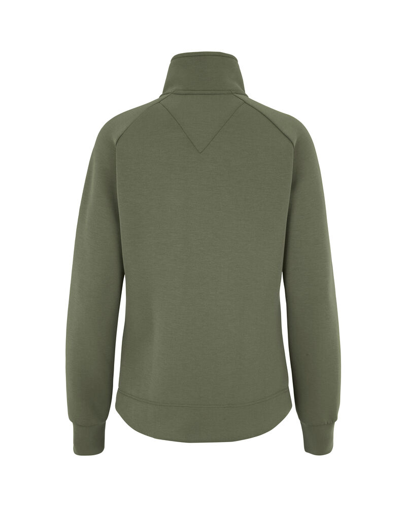 Genser laget i et dobbeltstrikket materiale med ekstra stretch. Genseren er laget av et blandemateriale med bl. annet sertifisert resirkulert polyester. Sydde mansjetter i nederkant og ermeavslutninger. Formet dobbel krage. Glidelås som går opp i kragen og frontlommer med dekorative, sorte glidelåser. Genseren har raglanermer og litt lengre rygg, noe som gir en svært god passform. Noe innsvinget modell.