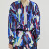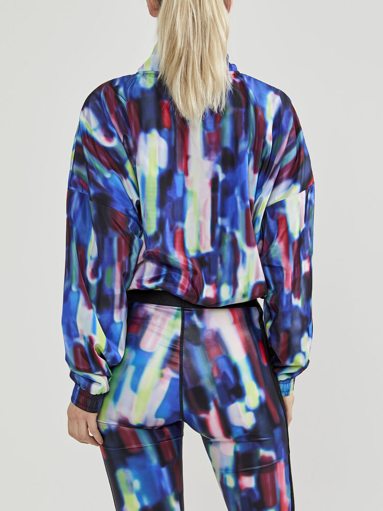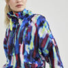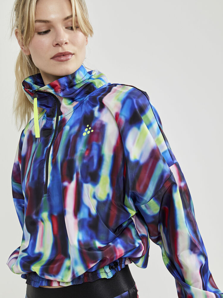 Flerfarget vindjakke med halv glidelås, løs passform, høy krage og elastisk midje med snor.