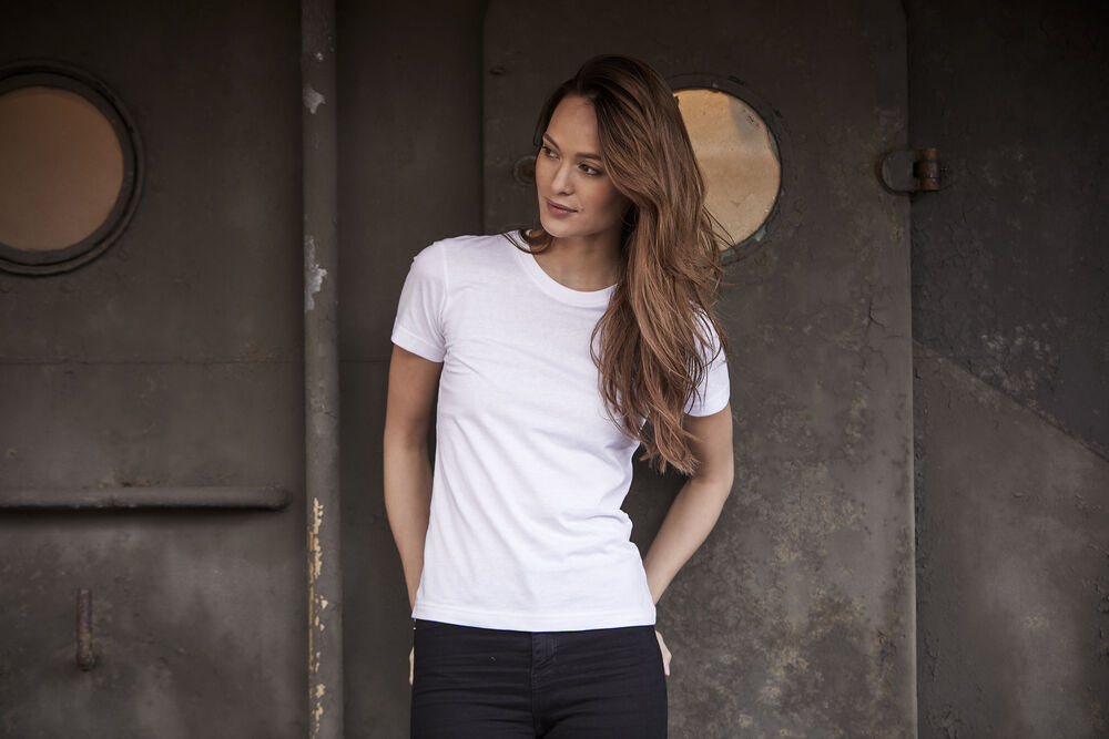 T-skjorte i komfortabel singeljersey. Nakkeribb og forsterket nakkebånd fra skulder til skulder. Herremodell i klassisk rundstrikket passform. Damemodellen har sidesøm og innsvinget passform.