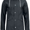 En klassisk regnjakke med metalliske trykknapper. Justerbar hette med en kant. To lommer foran med klaff. Gropventiler i metall, tapede sømmer og WP 8000.