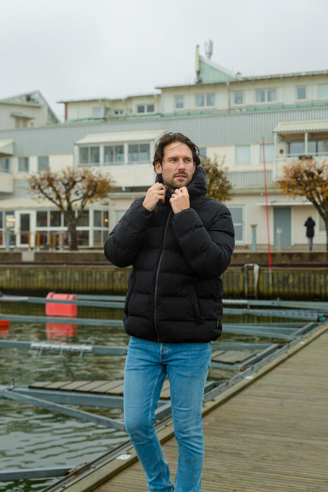 Kraftig, vattert jakke med fastsittende hette, helfôret med sydde, brede kanaler. Laget av sertifisert resirkulert polyester som er vind- og vannavstøtende (WP5000/MVP3000). Jakken er etterbehandlet med Bionic Finish Eco, som også gir en vannavvisende effekt. Jakken har synlig glidelås som går helt opp i kragen og frontlommer med glidelås og klaffer. Tre innerlommer, hvorav den ene har glidelås. Skjult, kraftig strikk rundt åpningen i hetten, i nederkant og i mansjettene.
