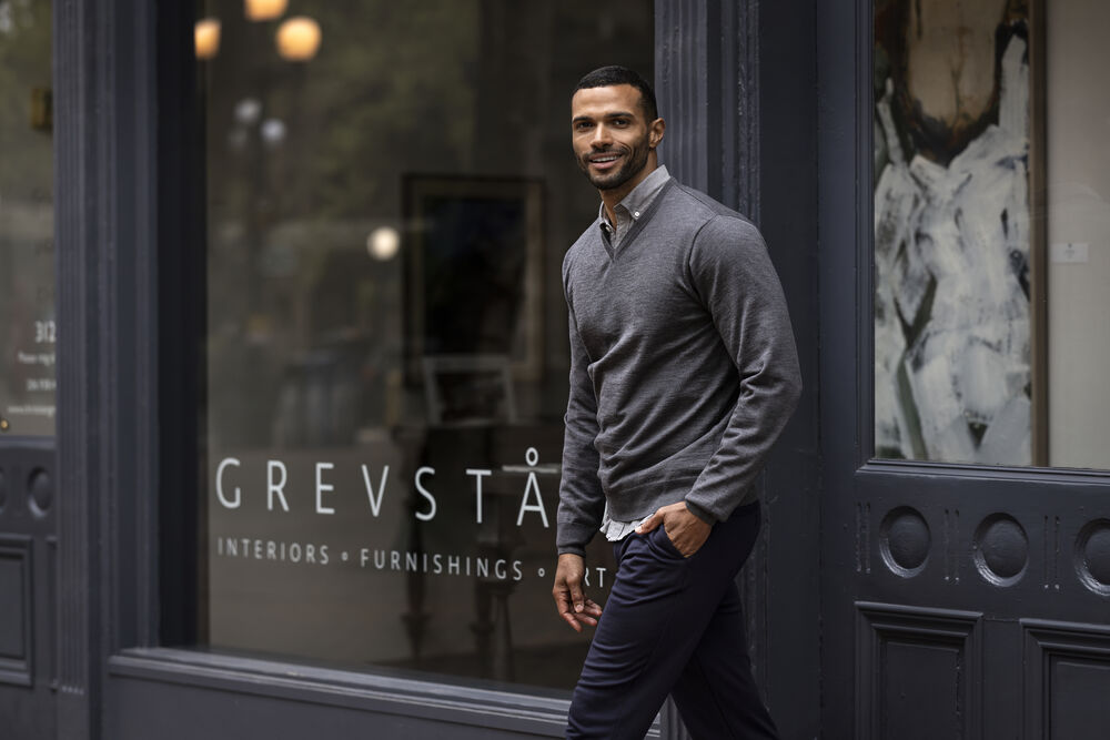 Moderne v-hals genser laget og designet for å følge dine bevegelser.