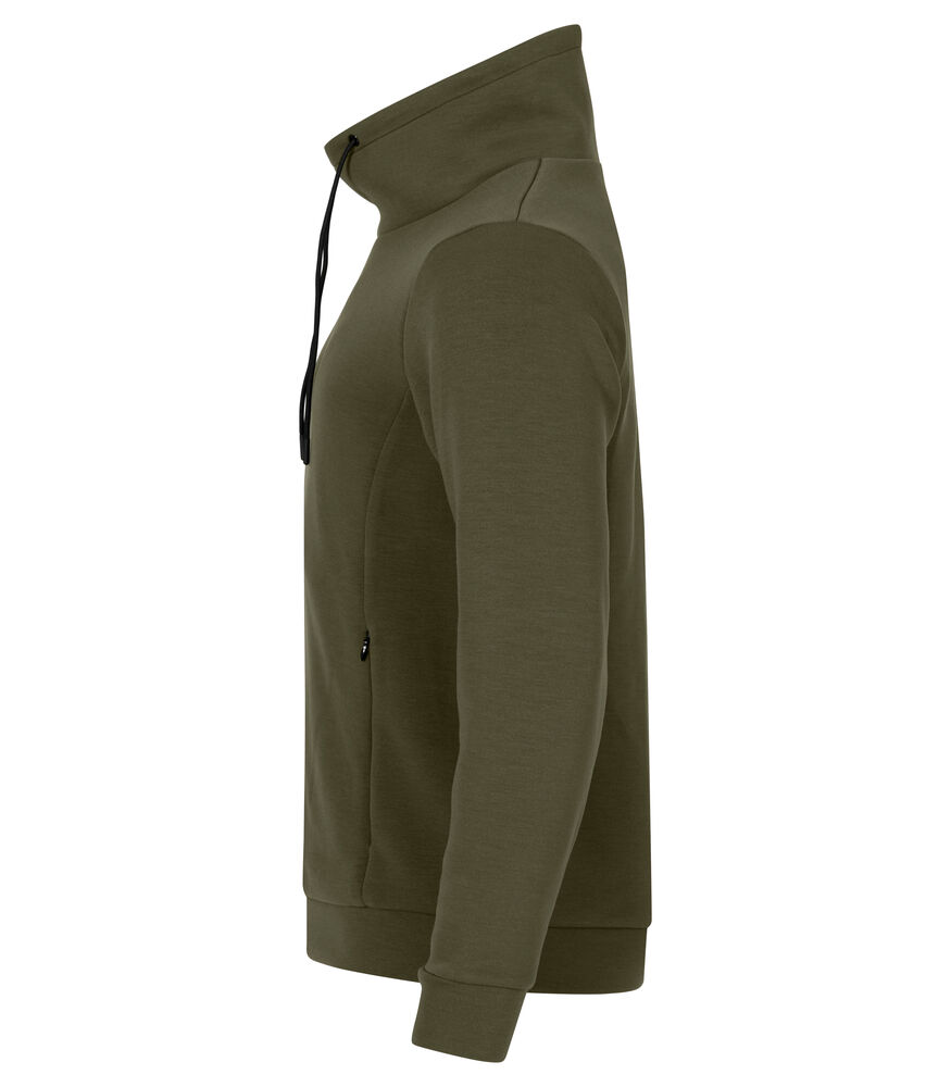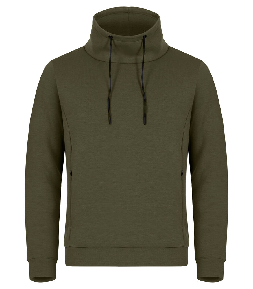 En høyhalset genser i et mykt Air Lyer-materiale. Genseren har to skjulte sidelommer med glidelås, og snøring i halsen. Mansjetter og nederkant i skallmateriale. Polyesteren som er brukt i genseren er resirkulert. Lett avtagbar etikett for rebranding.