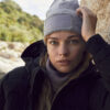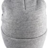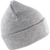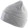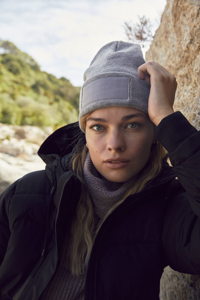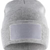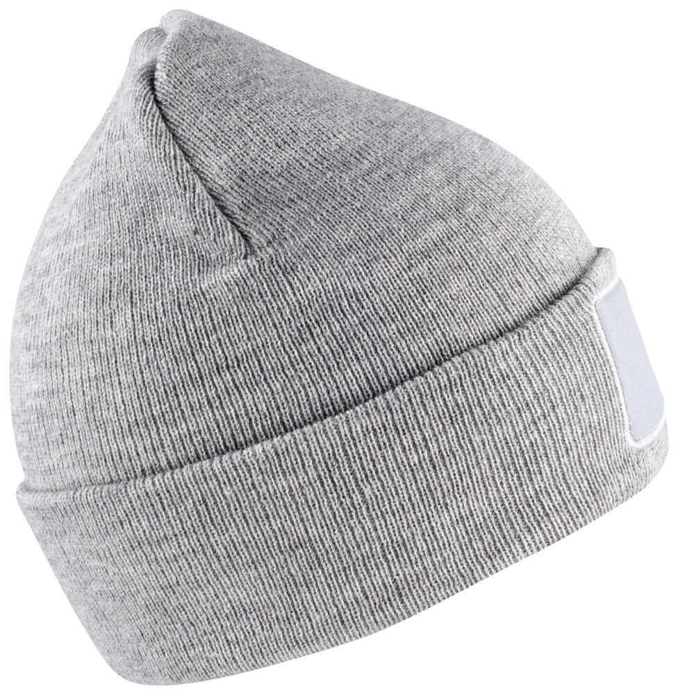 Strikket lue med oppbrett, med felt til å trykke på.