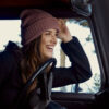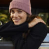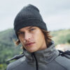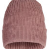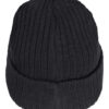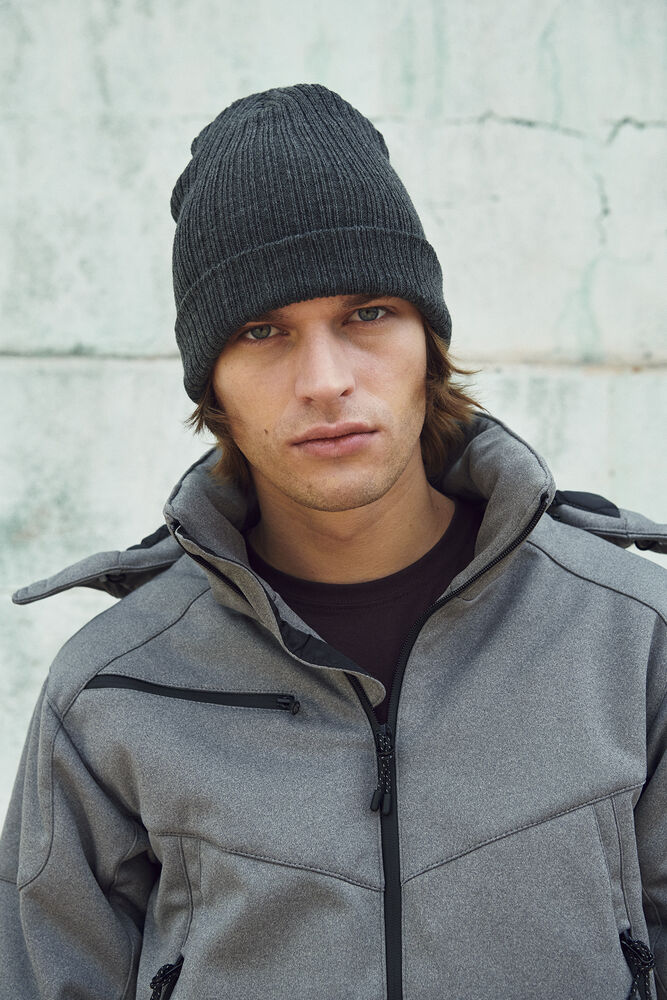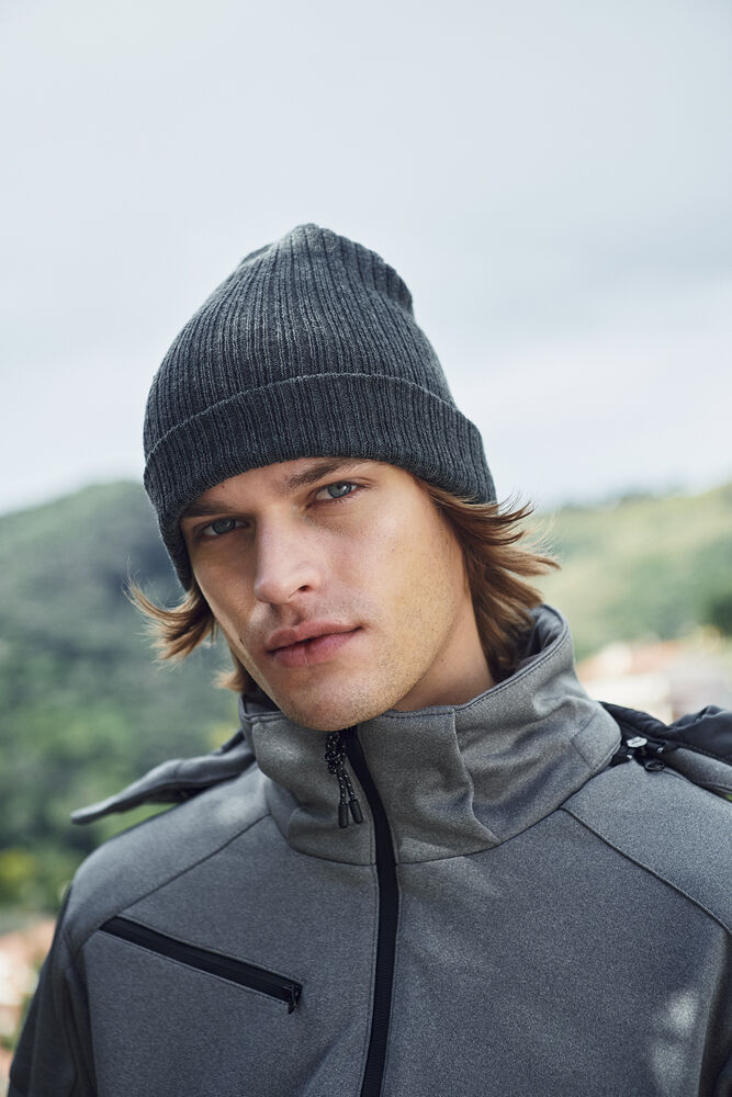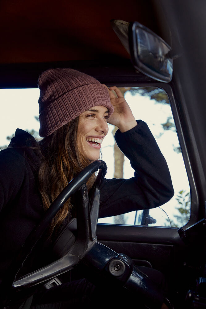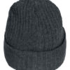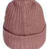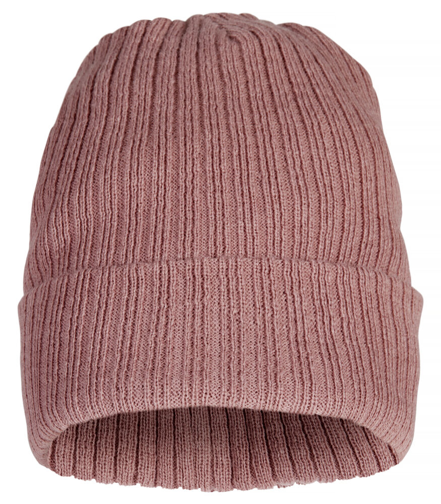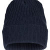 Ribbestrikket lue med brett og fire sømmer øverst.