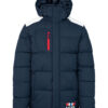 Varm, vattert vinterjakke. Vanntett SBS glidelås på bryst og frontlommer. Avtagbar/justerbar hette. To store innerlommer i mesh. Snorer i bunn. 2×2 ribb i mansjett.