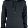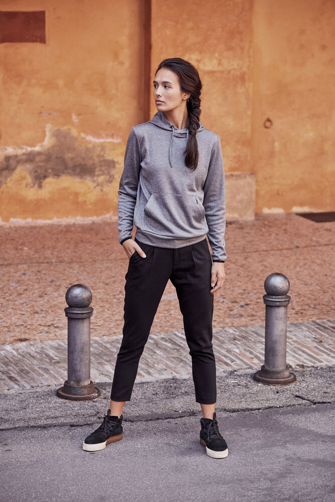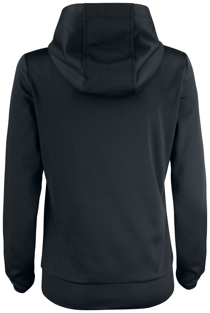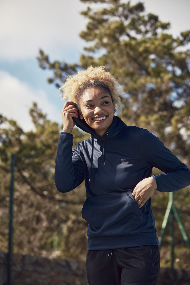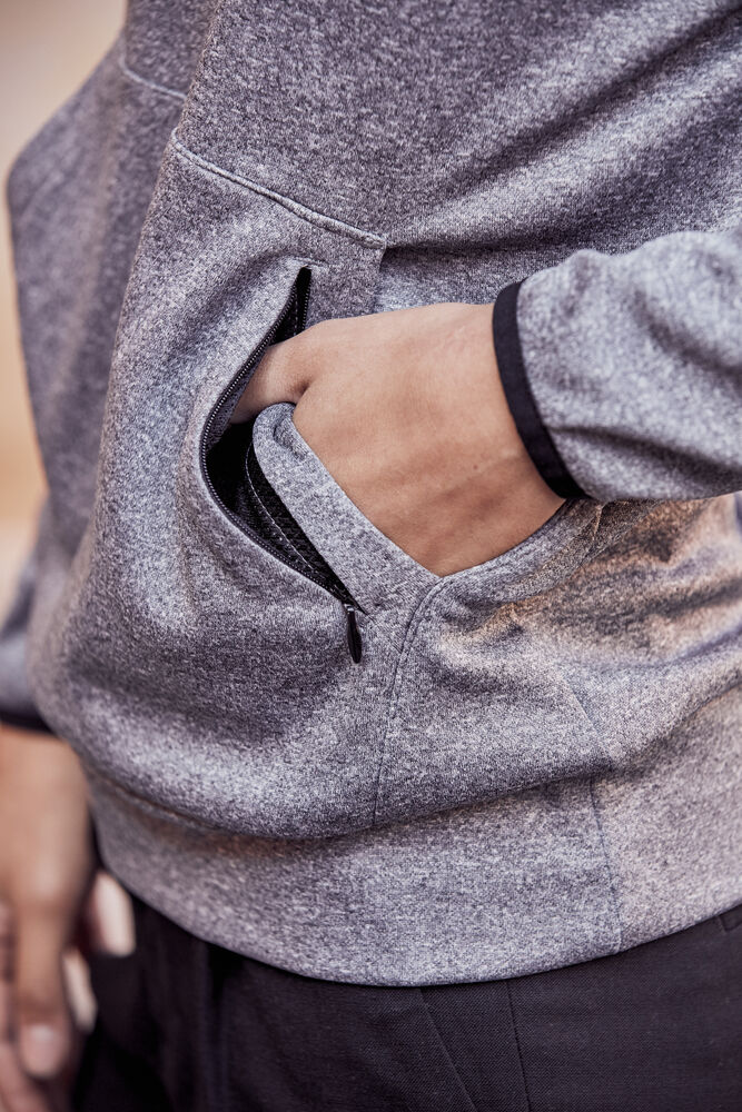 Funksjonell og sporty hettegenser. Leveres med en kengurulomme og en ekstra skjult lomme med glidelås. Hette har meshfôr og snøring. Elastisk strikk i ermekant. Mansjett i stoffet nederst.