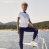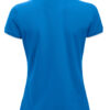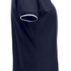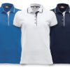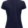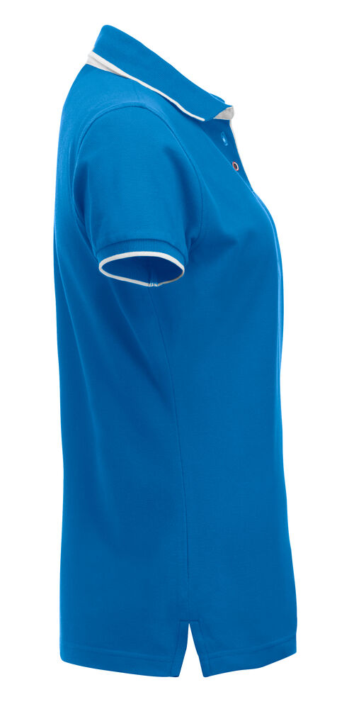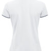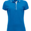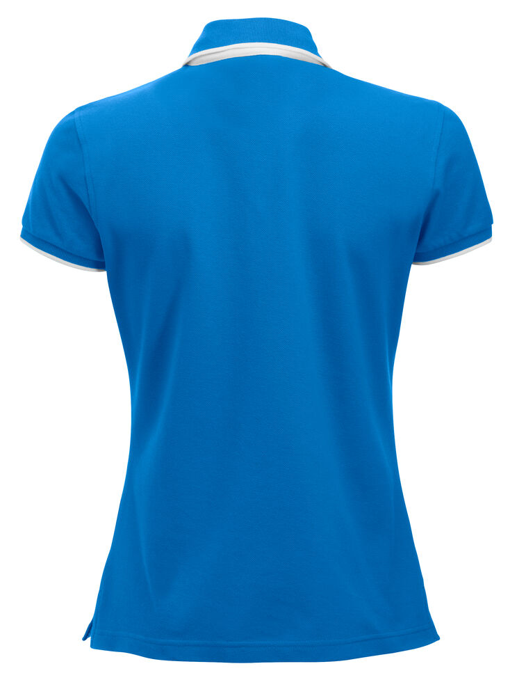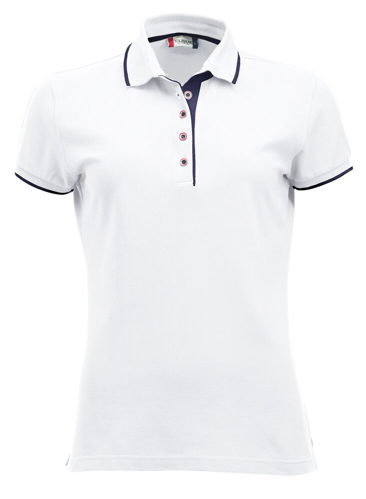 Pique med fargekontrast i knapper, nakkebånd, knappestolpe og splitt i sidene. Stående skjortekrage og knappestolpe med 3 knapper på herremodellen og 5 på dame.Kontraststripe på krage og armavslutning..