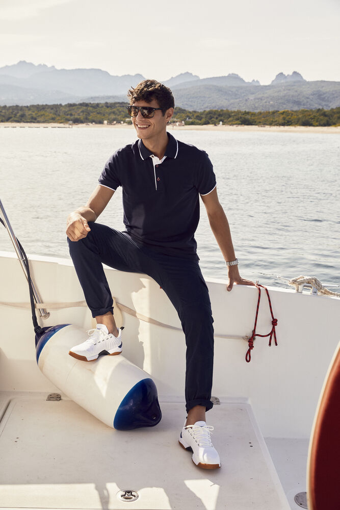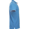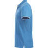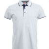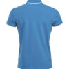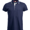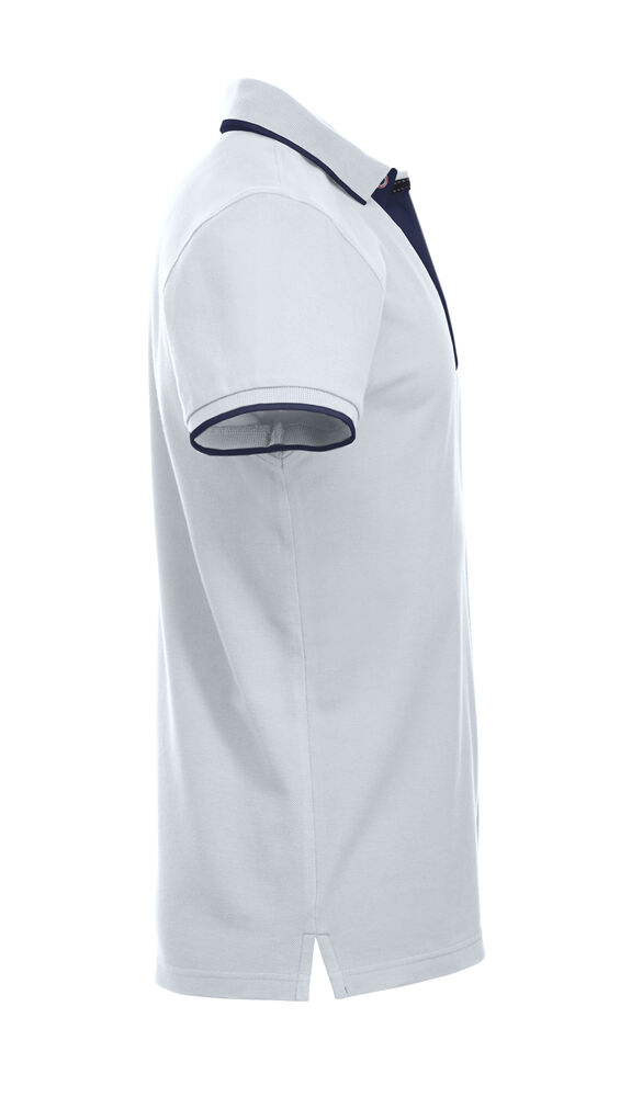 Pique med fargekontrast i knapper, nakkebånd, knappestolpe og splitt i sidene. Stående skjortekrage og knappestolpe med tre knapper på herremodellen og fem på dame. Kontraststripe på krage og armavslutning.