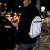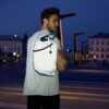 En smart gymbag/sekk i refleksmateriale. Frontlomme med glidelås og inngang til øretelefoner. Index: 250.