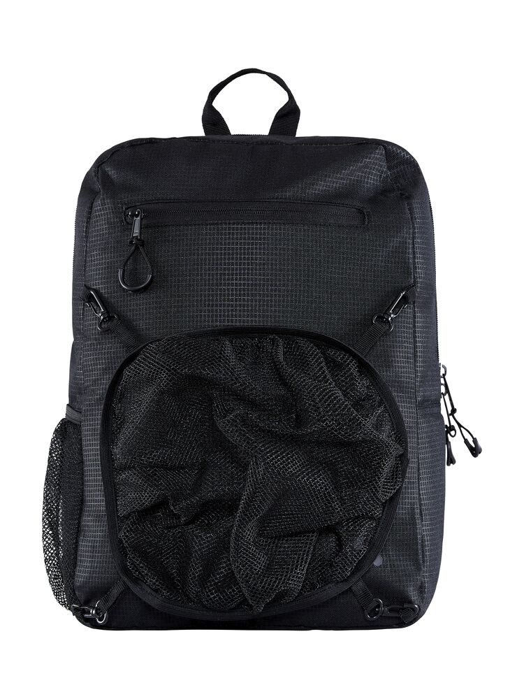 Praktisk ryggsekk av slitesterk polyester på utsiden og forsterket PU – behandlet innside. Ballnett i mesh foran på sekken, datalomme, lomme til vannflaske samt en liten ytterlomme.